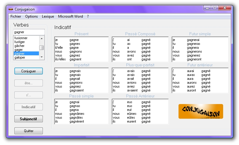 Ce logiciel tout simple permet de conjuguer 3750 verbes dans tous les temps.