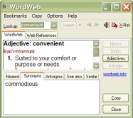 Vous avez beau avoir de bonnes notions anglais, il arrive toujours de buter sur un mot lors de la lecture d un site web ou pour les besoins d un devoir, ou d en chercher un synonyme pour une traduction. WordWeb est le genre d outil qui peut vous éviter de sortir votre volumineux dictionnaire : cet utilitaire très pratique repose sur la base de données Wordnet de l université de Princeton et propose une interface intuitive. Il vous suffit d entrer un nom pour avoir accès à sa définition avec plusieurs sens, à la prononciation phonétique et à une série d onglets contenant, selon les cas, les mots les plus proches orthographiquement, les synonymes, les contraires ou même des mots connexes, soit incluant le mot recherché (par exemple "window" peut renvoyer "automobile" ou "computer display"), soit des parties du mot recherché ("window pane", "frame" ...). La base de données de WordWeb est composée de 140000 mots et 115000 ensemble de synonymes, et le logiciel peut même être utilisé depuis le menu contextuel de certains logiciels dont Internet Explorer (mais pas Firefox) pour lancer une recherche depuis n importe quel mot sélectionné.